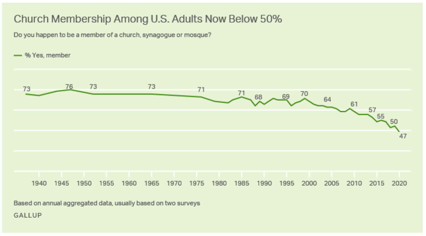 In 2021, Gallup announced that, for the first time in American history, church membership had dropped below 50% (47%).
