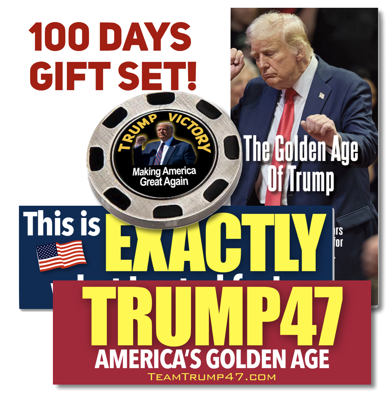 we'll send you three additional resources in our "100 Days Gift Set" -- our exclusive Trump Victory Medallion, Steve Elliott's "Golden Age" book and our "Trump 47" ReSticker.