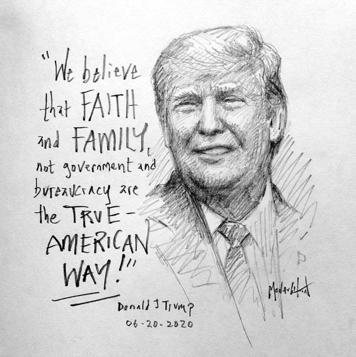 sketch of President Trump, who has against all odds stood in defense of our great nation's foundations of faith and family.