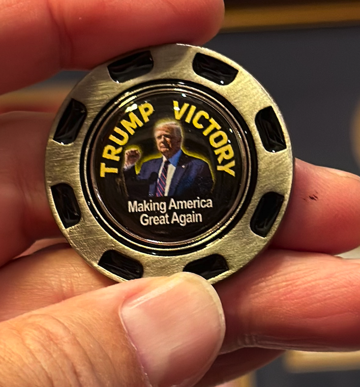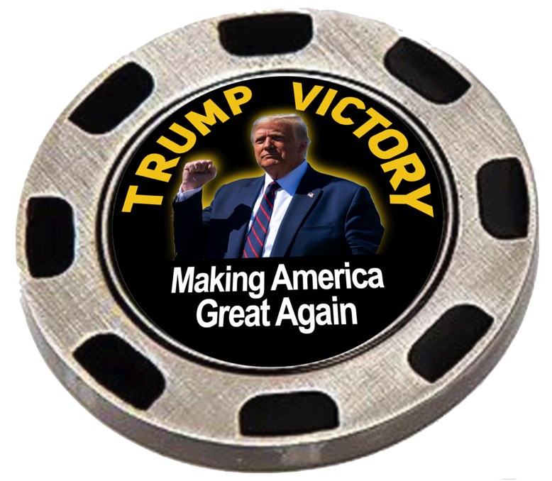 That's because this robust, metal medallion in "Dark MAGA" black with a custom-designed, magnetic "Trump Victory" resin centerpiece also serves as a golf ball marker honoring President Trump's favorite sport!